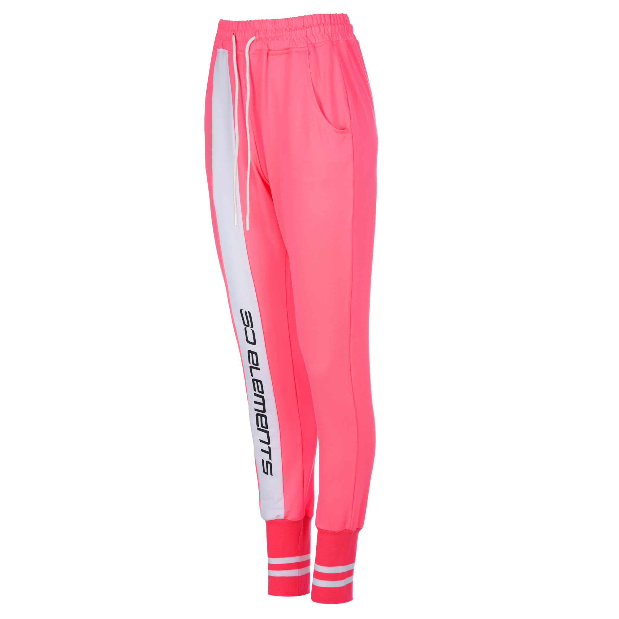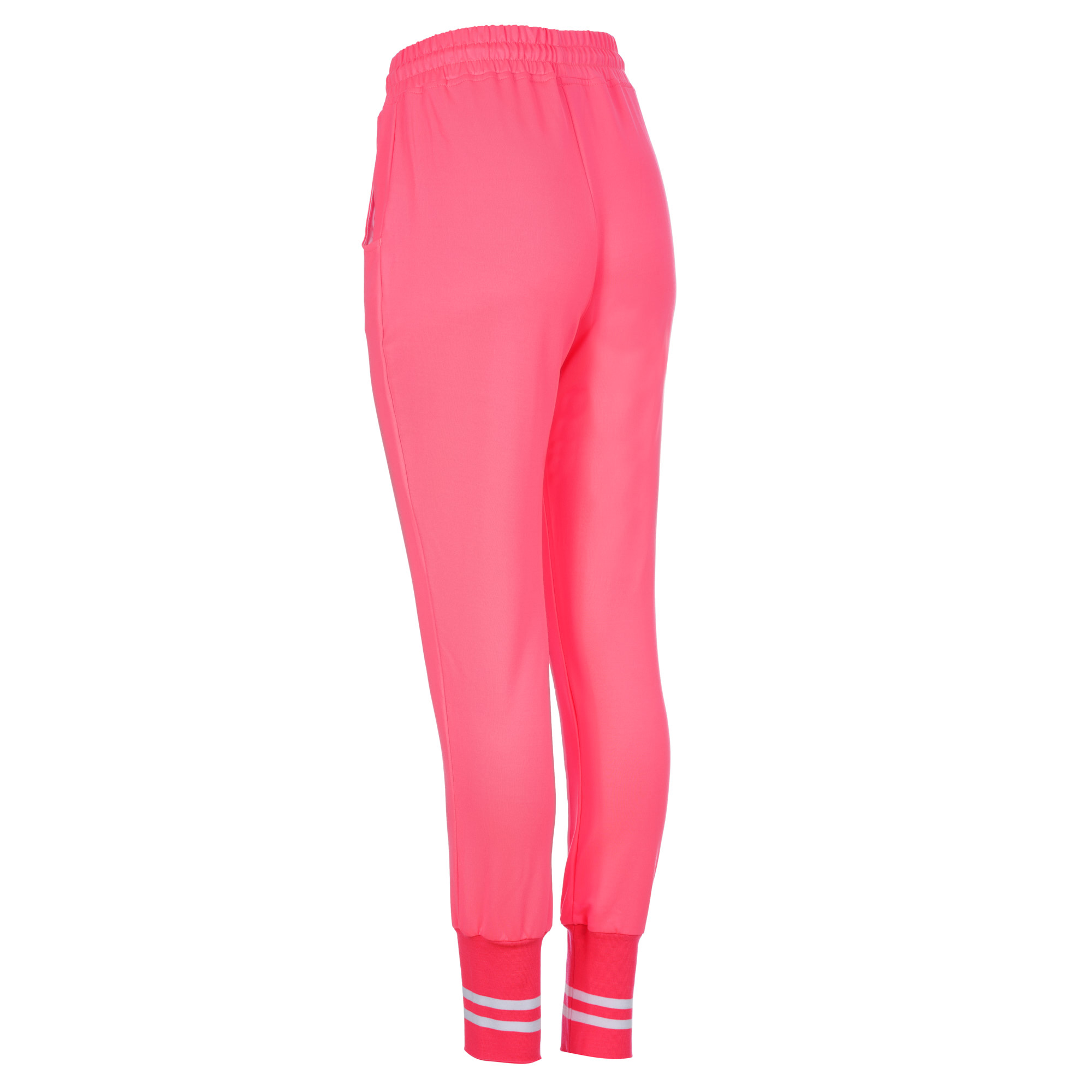 Дамски екип с асиметрична горница в предната си част.Широки маншети на ръкав и крачол,придаващи съвсем различен стил.Една съвсен нова визия,свежо съчетание на неоново розово и бяло.Свободен силует,долнище с паднало дъно.Може да се носи панталона като 7/8 ,  както и ръкава на блъзата като 7/8