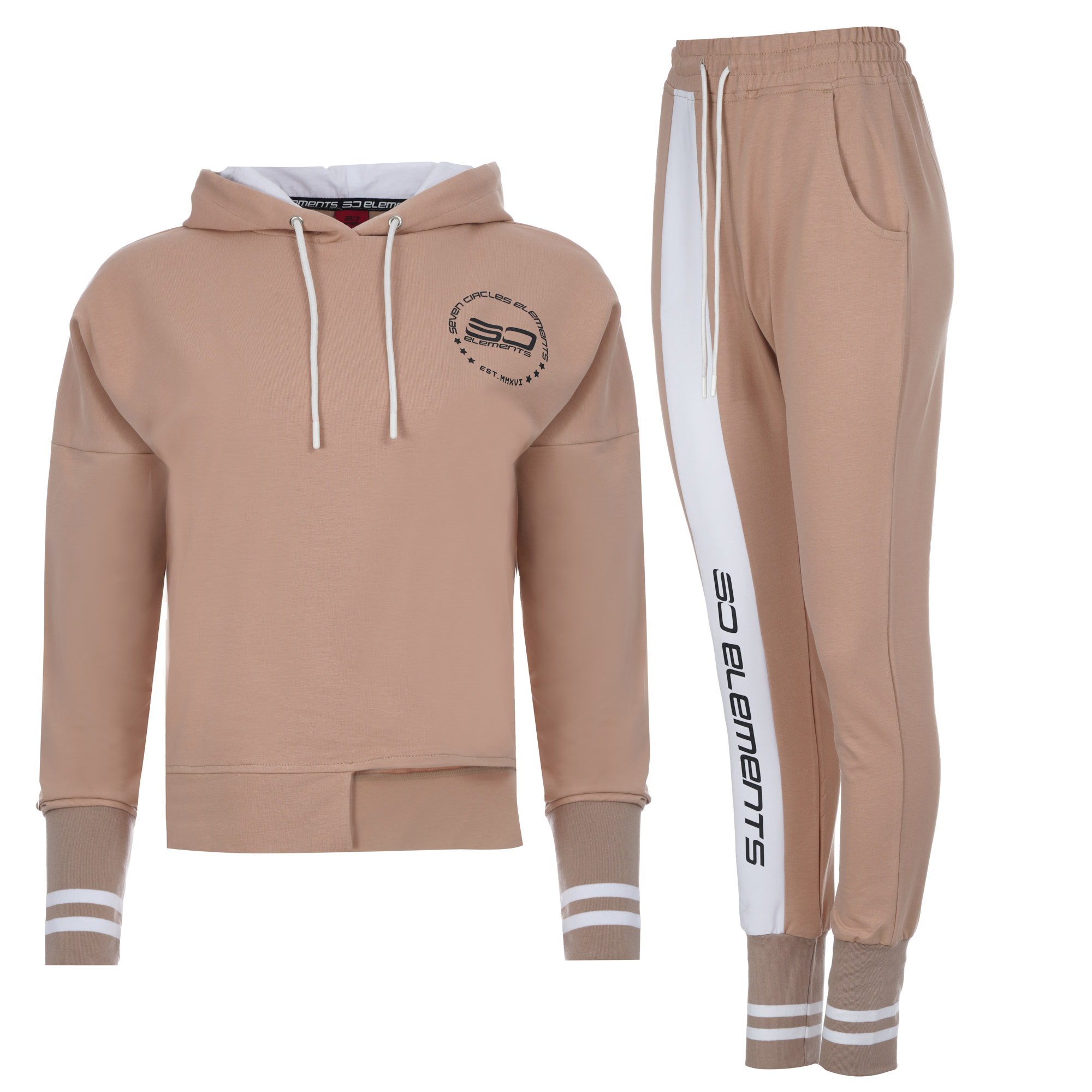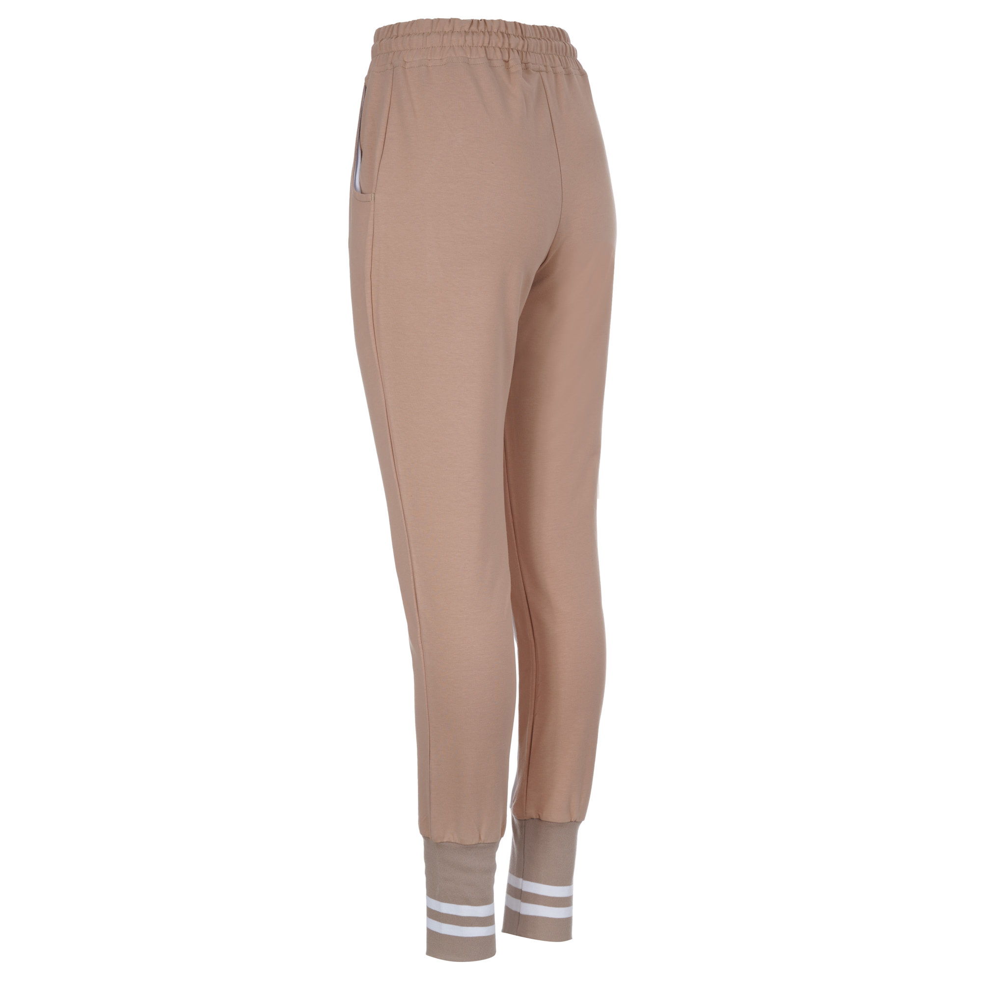 Дамски екип с асиметрична горница в предната си част.Широки маншети на ръкав и крачол,придаващи съвсем различен стил.Една съвсен нова визия,свежо съчетание на бежово  и бяло.Свободен силует,долнище с паднало дъно.Може да се носи панталона като 7/8 ,  както и ръкава на блъзата като 7/8