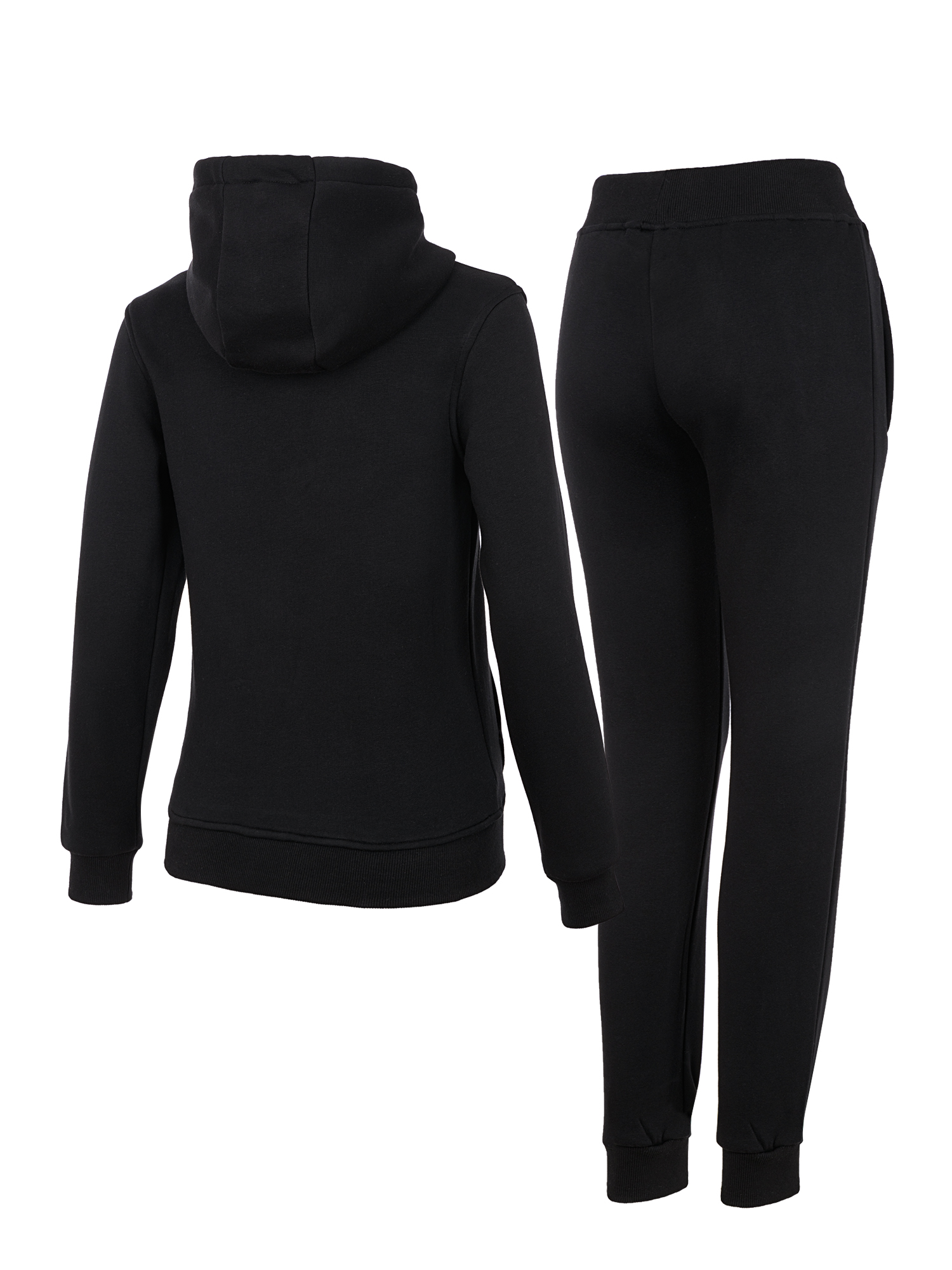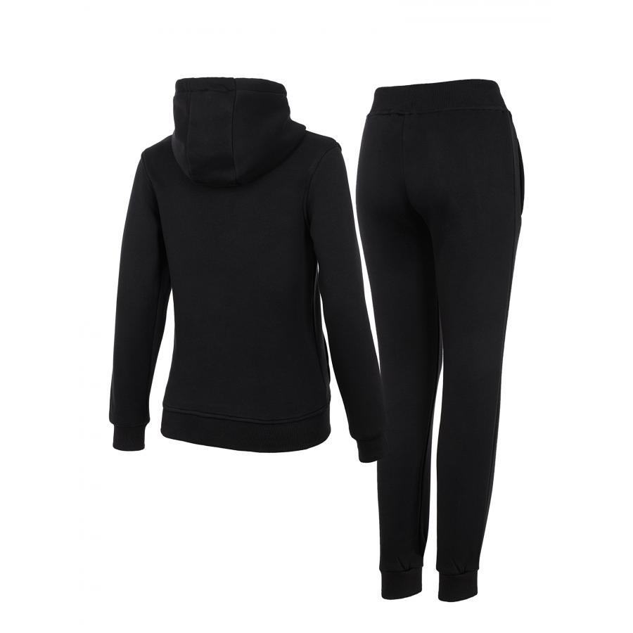 Дамски спортен екип от 2 части,ватирана памучна материя подходяща за студените зимни месеци.Суитшърт с качулка и връзки,джоб тип “ кенгуру“ и голямо бродирано лого,панталон с ластичен колан с връзки и маншети на крачолите,два джоба с цип и бродирано лого.Материя е мека и еластична ,ватирана,допринасяща за комфорта и топлината през студените дни.