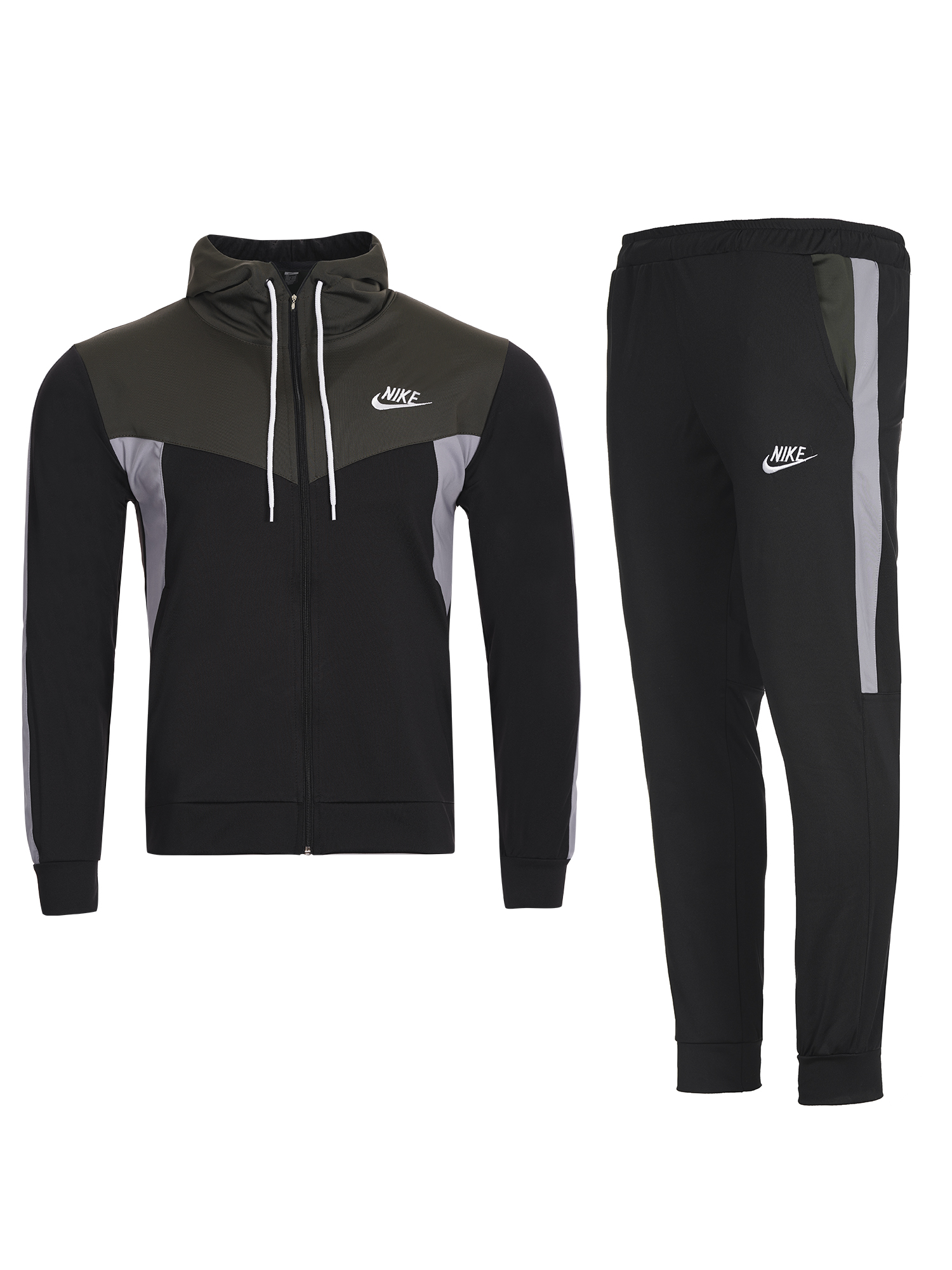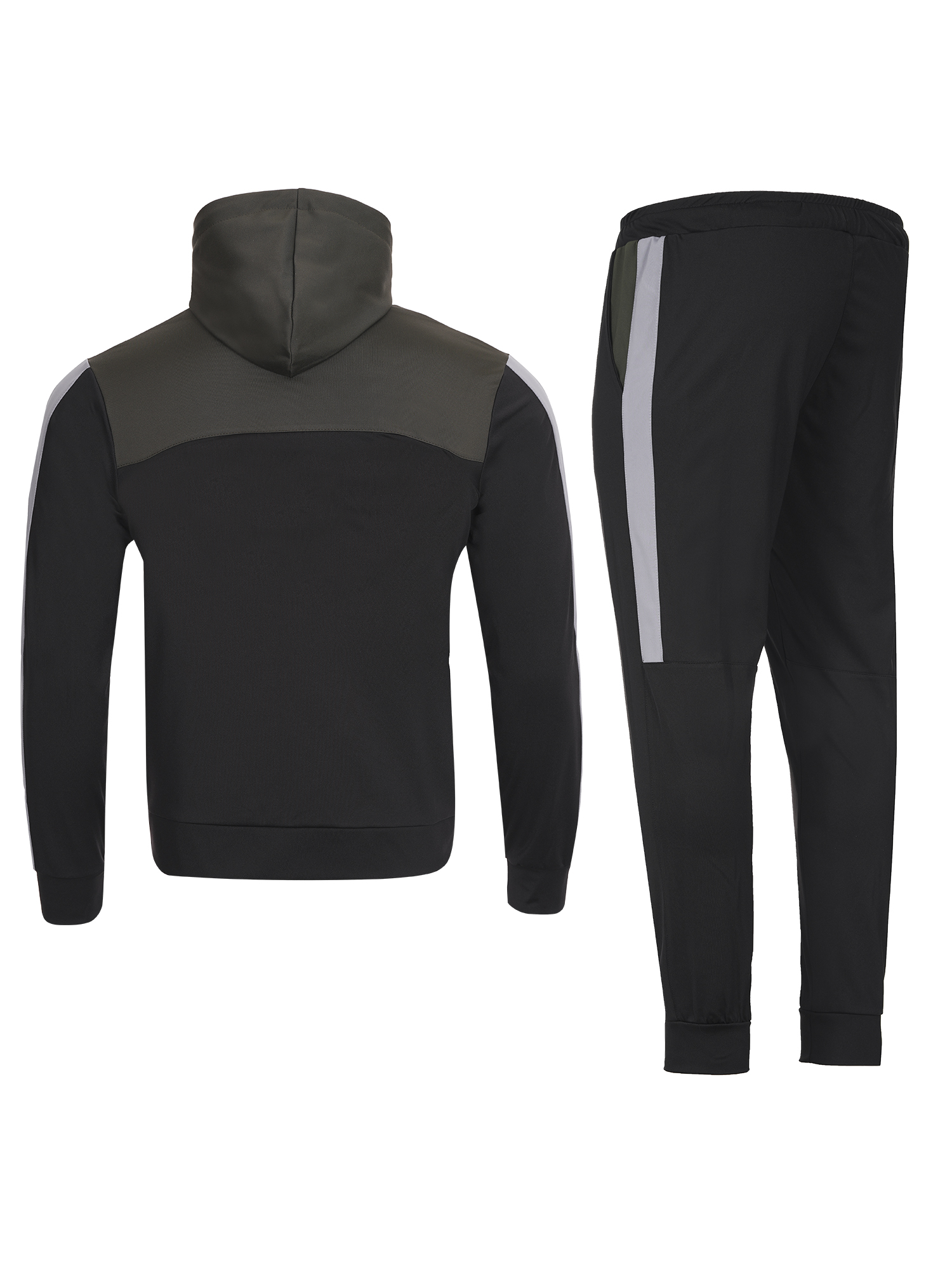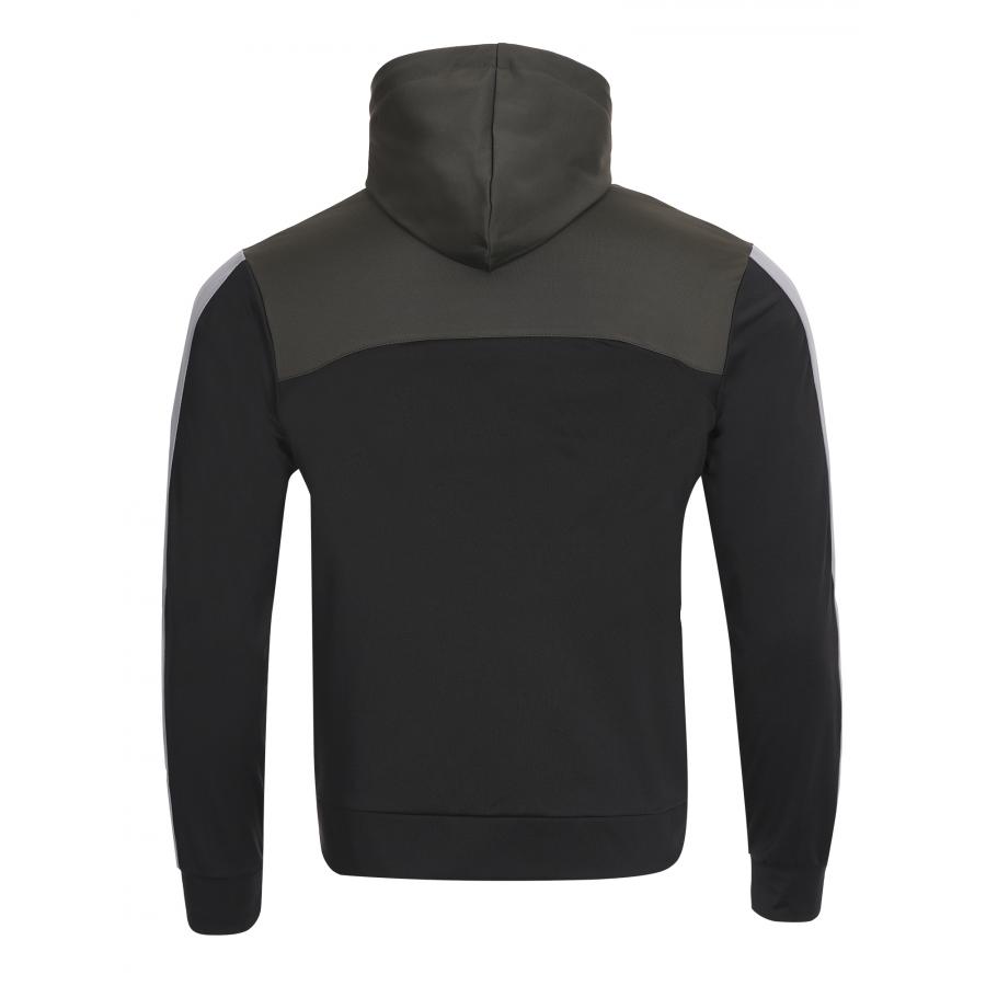 Мъжки спортен екип подходящ за  спорт и ежедневие.Екипа е полиестерен с ластични маншети  и колан,с висока яка и качулка.Има странични джобове,закопчаването е с цип.